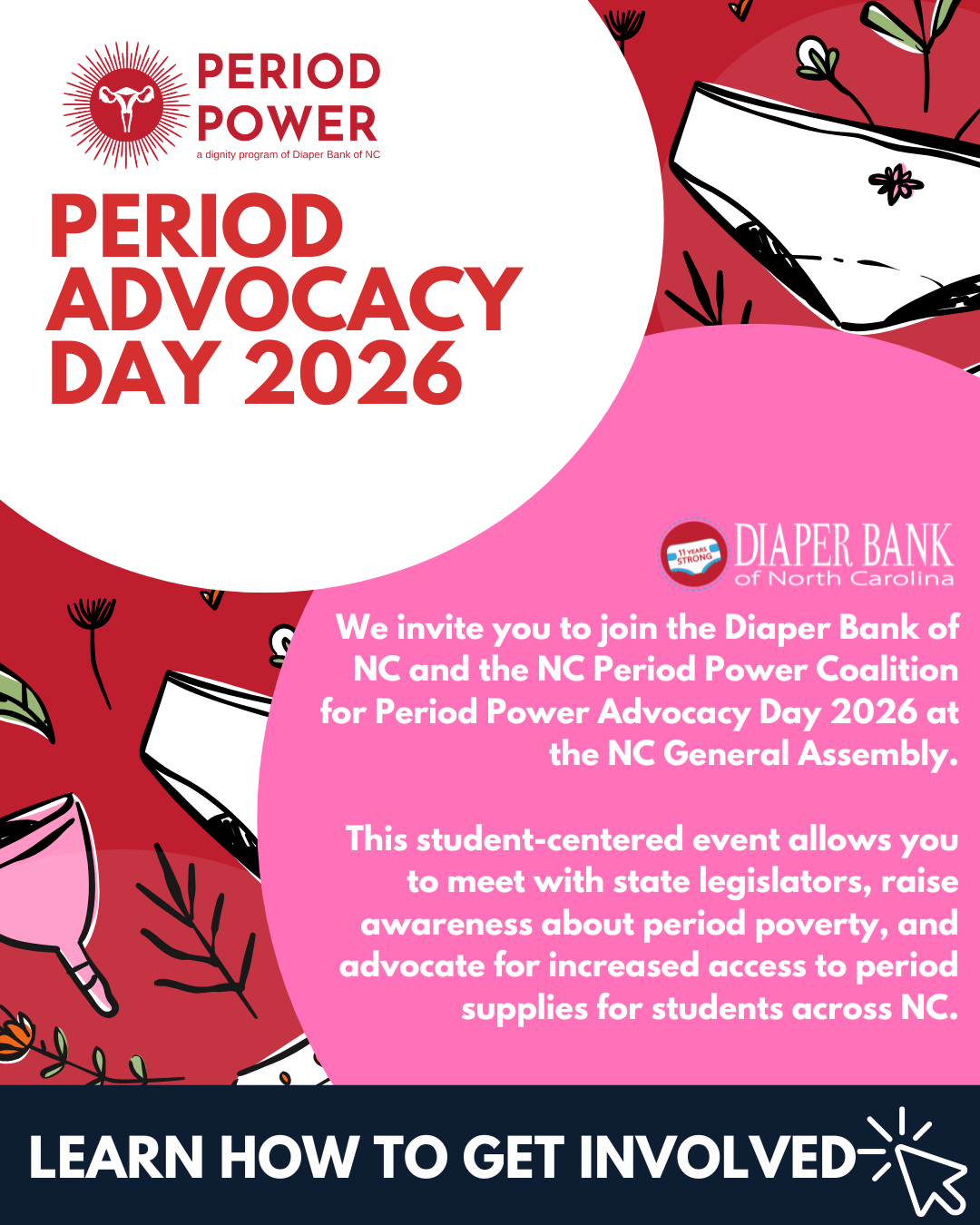 We invite you to join the Diaper Bank of NC and the NC Period Power Coalition for Period Power Advocacy Day 2025 at the NC General Assembly. This student-centered event gives you the opportunity to meet with state legislators, raise awareness about period poverty, and advocate for increased access to period supplies for students across NC.