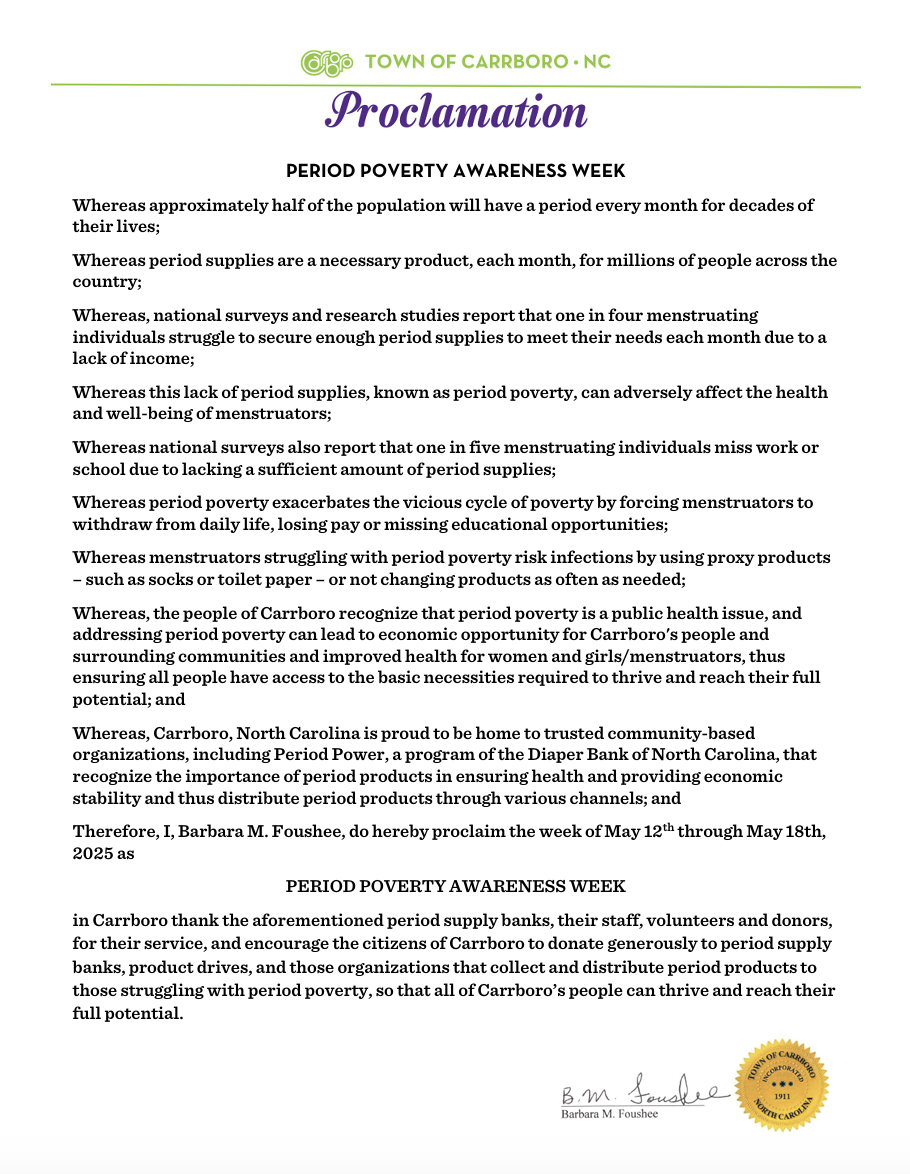 CARRBORO, N.C. – Mayor Barbara Foushee proclaims the week of May 12-18, 2025 as Period Poverty Awareness Week in Carrboro.