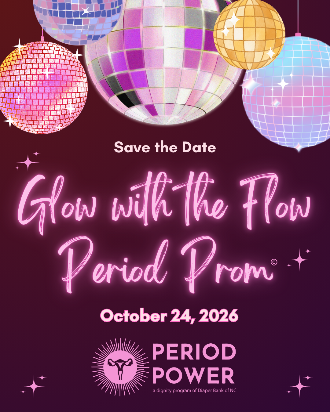 a fundraising gala in support of our Period Power Program!The Period Prom will welcome over 200 guests, including passionate supporters and prominent local business leaders. Sponsors and attendees will enjoy a lively, prom-inspired evening while supporting the vital work of our Period Power Initiative, which provides essential menstrual products to students across North Carolina. As a valued sponsor, your business will receive prominent recognition through our promotional materials, including: